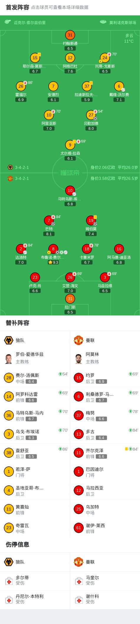 北京时间12月9日4:00,英超第15轮继续进行,曼联作客莫利诺克斯球场挑战狼队,本场主裁判为索尔兹伯里。上半场,库尼亚助攻B费破门,贝勒加德扳平比分。下半场,达洛特助攻姆伯莫破门,B费精妙挑传助攻芒特破门后自己又罚入一粒点球。最终,曼联4-1客胜狼队。