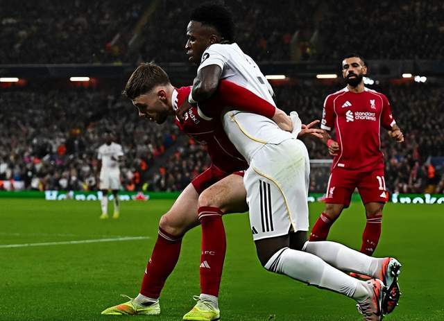 皇马的3.3亿欧元双枪,占不到任何便宜。22岁的利物浦右后卫布拉德利,上演欧冠成名之作,完全锁死维尼修斯。维尼修斯的招牌技术——加速爆趟、急停急转、1V1溜底线,在布拉德利面前毫无作用。whoscored给维尼修斯打出5.9分,全队最低分。